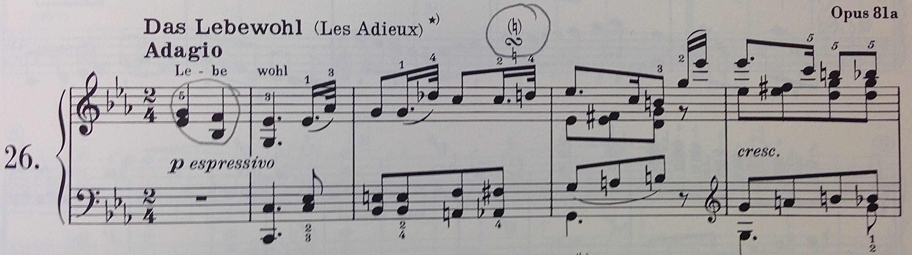 It has been suggested by others that Mahler mined the opening of Beethoven’s Piano Sonata No. 26, Op. 81a “Les Adieux” to find motives for the Ninth. Beethoven titled this sonata “Das Lebewohl” – usually translated as “farewell” in English – and wrote the word over the first three chords. The Incomplete Motive consists of the first two notes of the sonata’s opening melody: