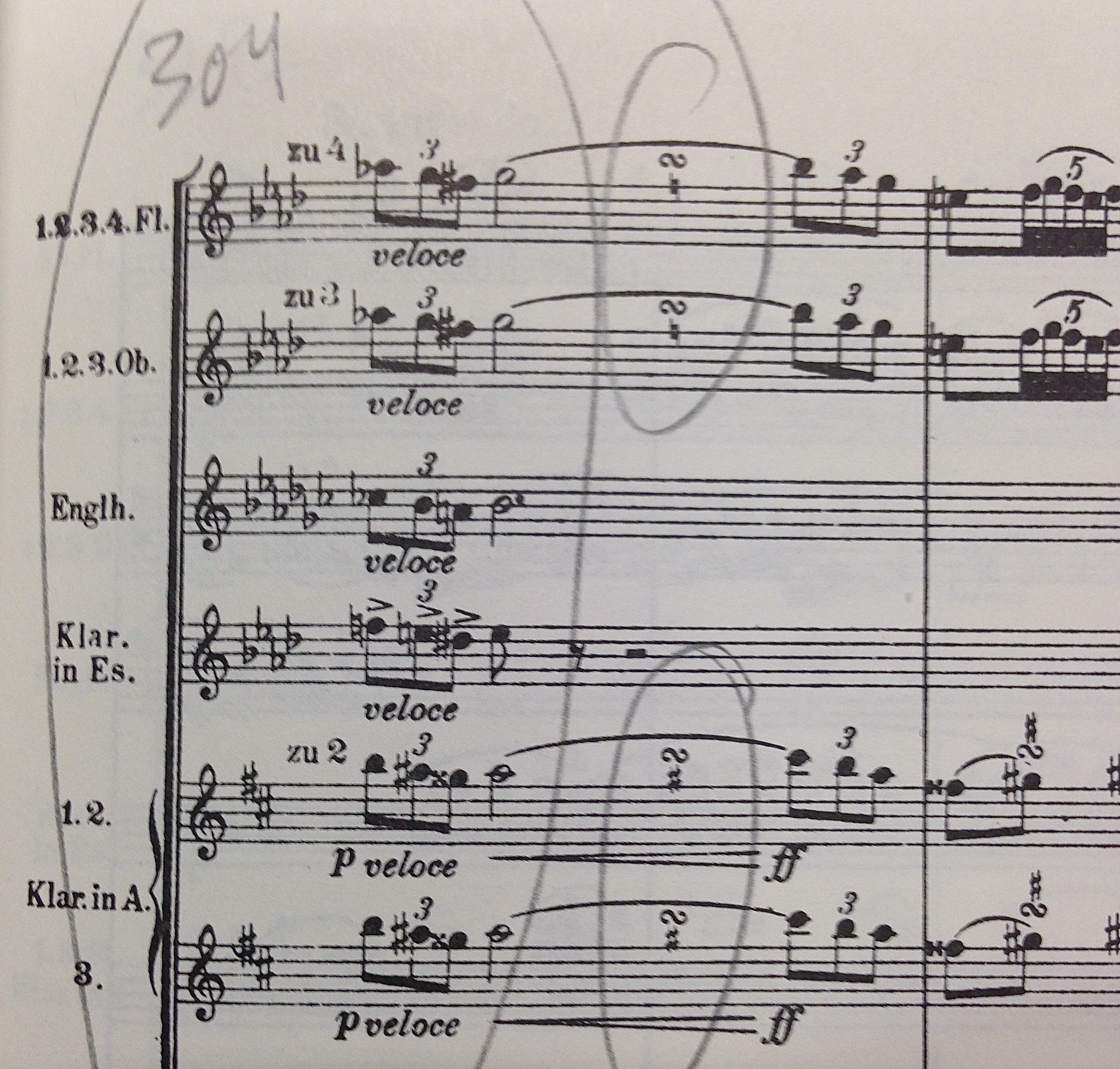 The Turn makes its first appearance in the Ninth nearly three-quarters of the way through the First Movement, during one of the movement’s climaxes. It is one of the most vehement moments of the first movement, and The Turn is played twice in succession on a high g’ by woodwinds and strings. Mahler writes out the notes the first time it appears in m. 304 and marks it veloce – rapidly – then immediately repeats it, this time marking it with the traditional turn symbol. Mahler is using The Turn here in an emphatic manner: he repeats it again in m. 305, and then then again at the apotheosis of the climax at m. 308. Here he uses The Turn to propel the melody up a tritone at the moment in the score marked “Höchste Kraft” (highest power).