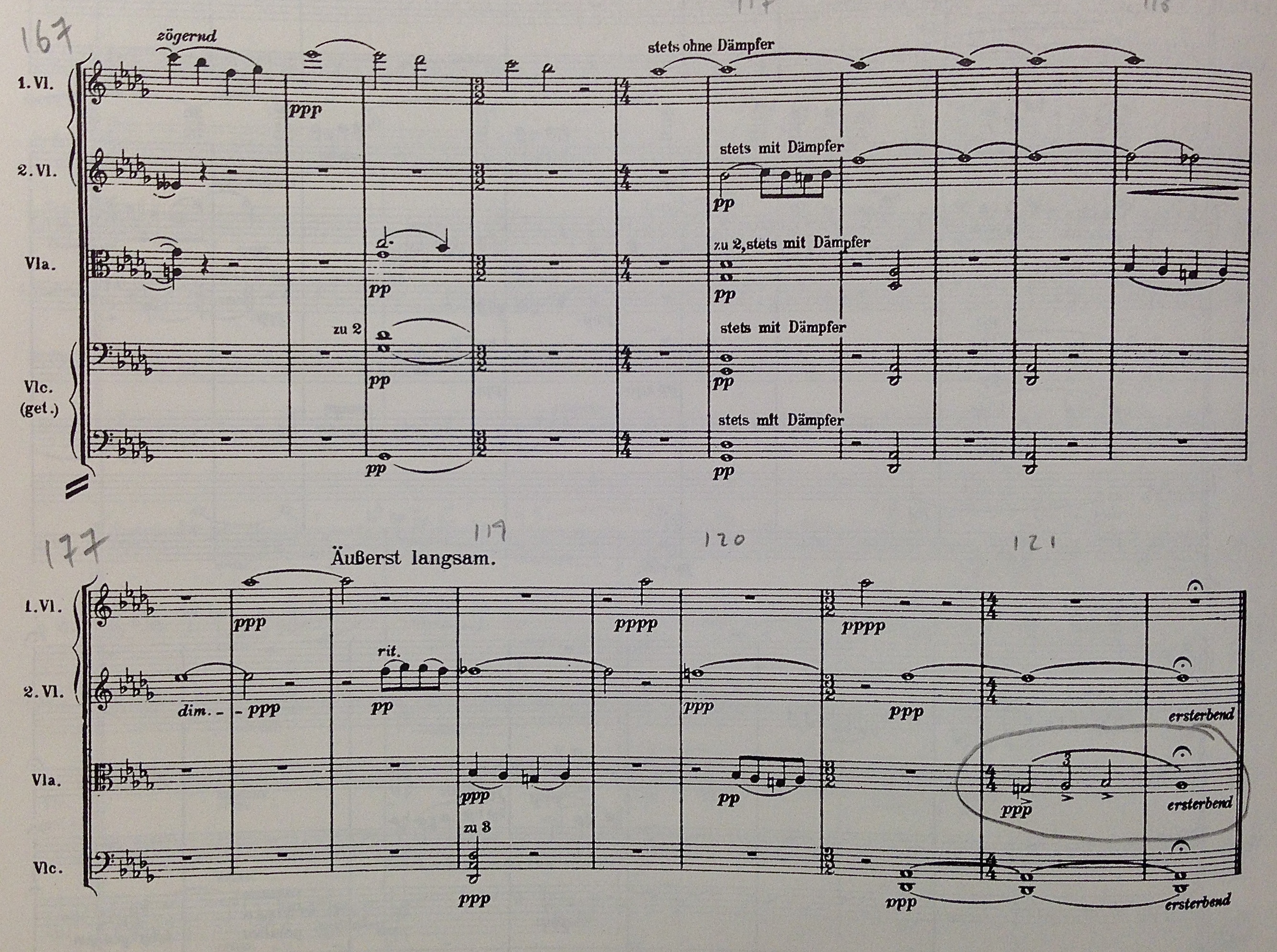 The last page of the symphony, which Giancarlo Guerrero described to the orchestra during rehearsal as the most remarkable ending in the symphonic literature (my paraphrase), is marked Adagissimo and scored for strings only playing various degrees of pianissimo (pp, ppp, and pppp!). The final statements of The Turn are made by the violas, who beginning at m. 176 play The Turn three times with long pregnant pauses between each, and then one last time inverted. Mahler only inverts The Turn one other time in the course of the movement – played by the violins in m. 67 – and it is remarkable and dramatic that he chooses to end the symphony this way.