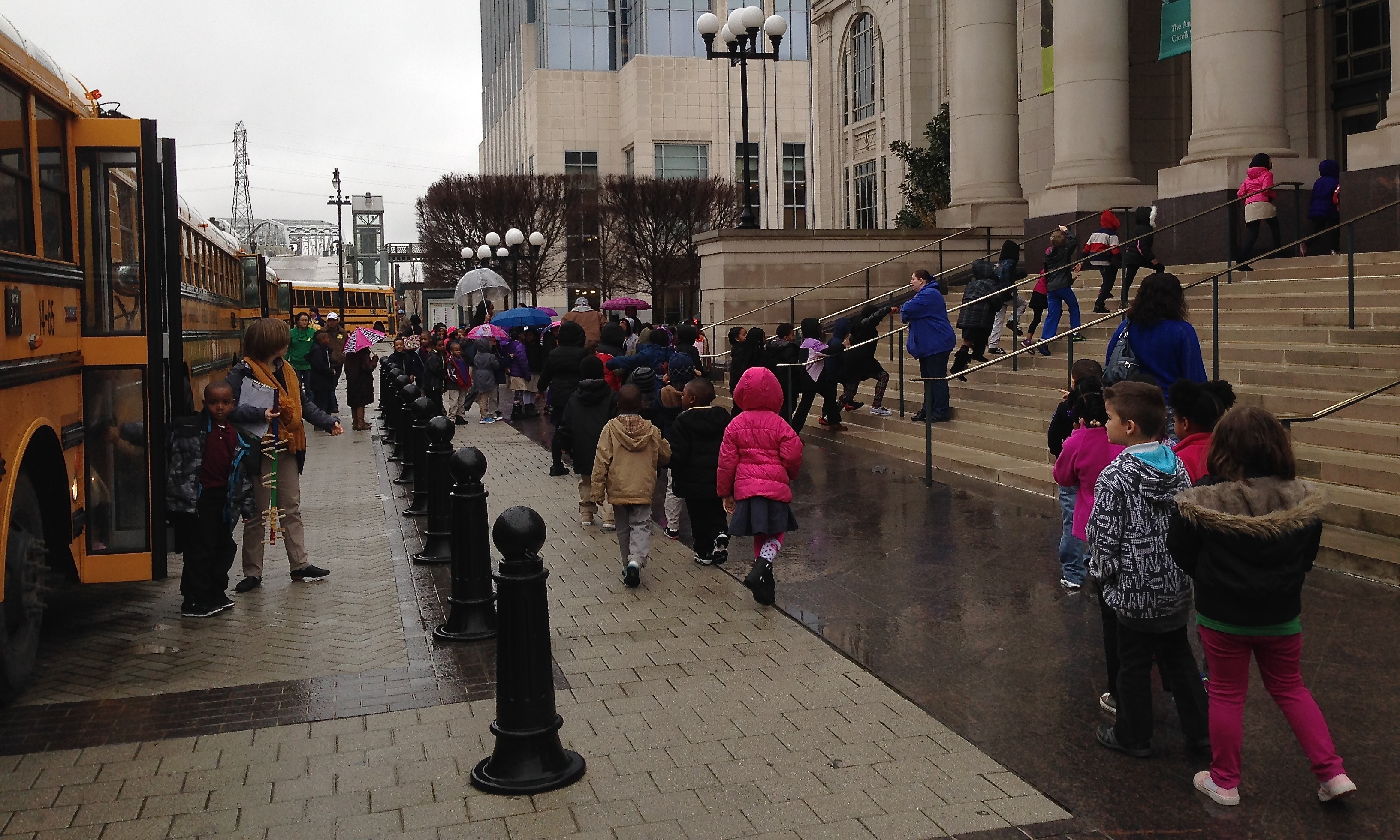 This morning’s event is a back-to-back, with over 3000 students from Kindergarten through Second Grade scheduled to attend – 39 school buses will arrive in two shifts as well as hundreds of homeschool students. It is raining intermittently and the weather is forecasted to turn bitter later in the day – there is talk among the musicians and staff about whether or not we will have to cancel tomorrow’s concerts (a repetition of today’s back-to-back YPCs).