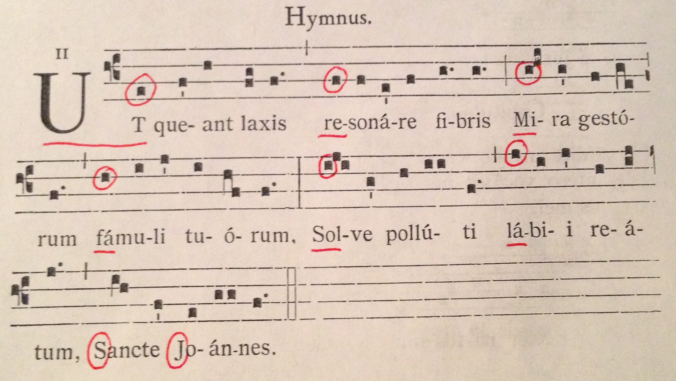 “Ut queant laxis” from a contemporary copy of the Antiphonale Monasticum ~ traditional Gregorian Chant notation is written in notes sung on a single syllable called “neumes” on a four-line staff