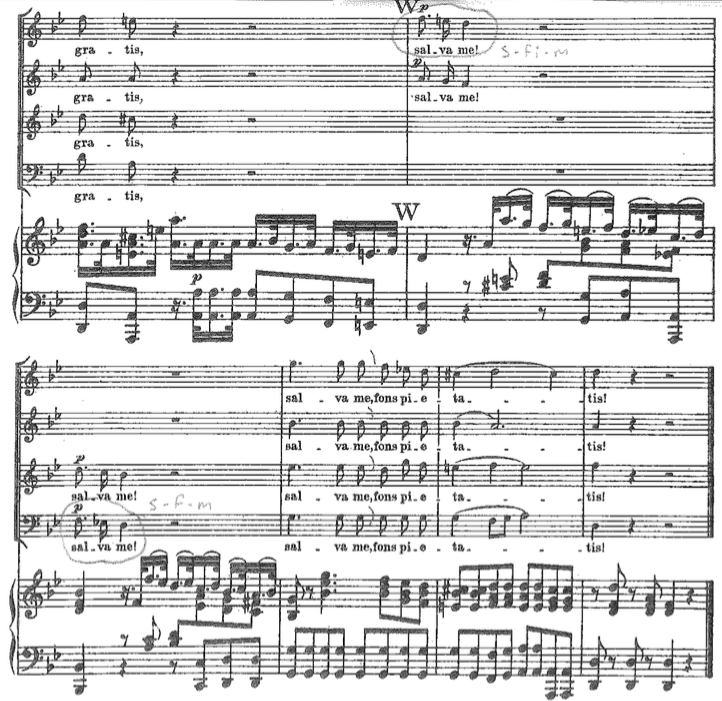 The first movement we learned was Rex Tremendae, which begins grand and majestic and ends as a plaintive whimper.  On the final page of this movement, first the sopranos and altos plead in thirds “salve me!” (save me) which is echoed an octave lower in the next bar by the tenors and basses.  In our movable do, la-based minor solfège method, the syllables for the soprano voice (the melody) in the first of these statements are “sol-fi-mi”  and in the echo of the melody sung by the basses in the next measure they are “sol-fa-mi”.  The solfège is the text.  Here, in one of the most pathetic and touching moments of the entire Requiem, Amadeus makes a joke.