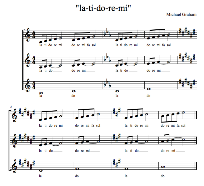 Section the choir into three groups and assign each one a part.  We would sing this through three times, each time starting a half step higher – until each section had sang each part.  This exercise subtly teaches/reinforces understanding of relative and parallel key relationships as well as Major and minor triads, is a great warm up and…students would regularly beg to sing it.