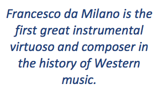 Little known today, Francesco da Milano was once the most influential and renowned lutenist in Europe, and in fact Francesco is the first great instrumental virtuoso and composer in the history of Western music. He is first in a long line of composer/performers of instrumental music that includes Mozart and Beethoven – his descendants and heirs – and many others down the centuries, whose music was so powerful and important that it disseminated beyond national boundaries and influenced contemporaries as well as succeeding generations of musicians. His countrymen called him il divino (the divine), the epithet he shared only with his contemporary (painter, sculptor, architect) Michelangelo.