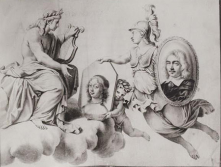 Minerva presents Apollo (holding a lyre) with portraits of Denis Gaultier and Anne de Chambré in an engraving by Robert Nanteuil from La Rhétorique des Dieux, 1652