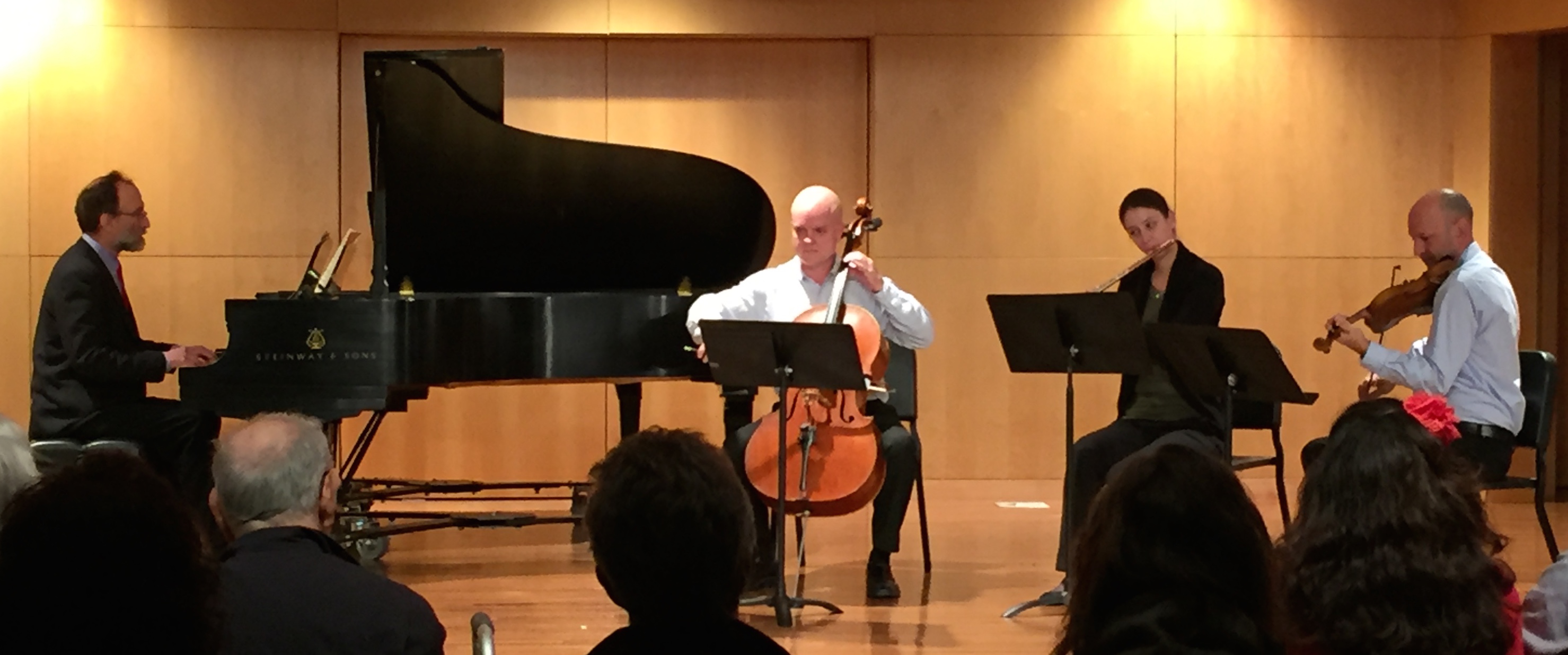 Roger Wiesmeyer, piano, with Keith Nicholas, cello; Kathryn Ladner, flute; and Jeremy Williams, violin ~ November 19, 2005, W.O. Smith Music School, Nashville ~ photo by Kelley Bell