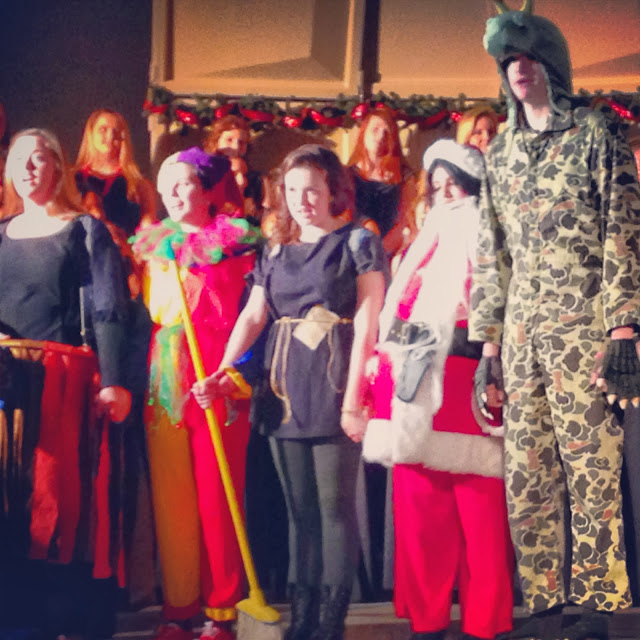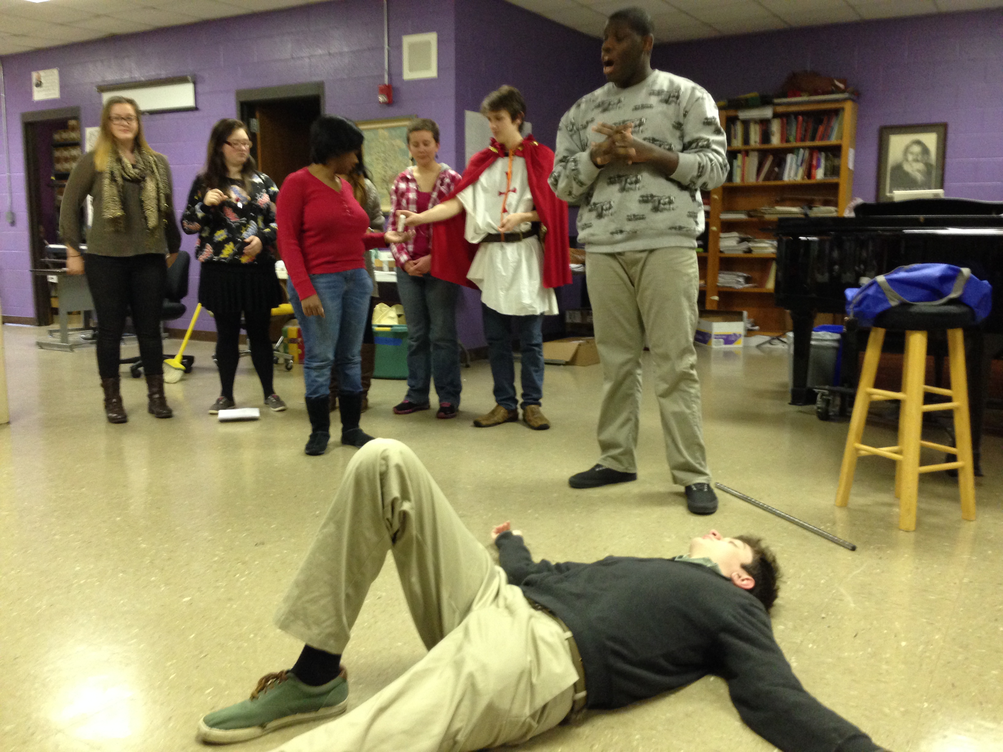 The first rehearsals were blocking rehearsals – directing where, when, and how the actors move during the play – and usually it took a couple of rehearsals to block the whole play. Our mummer’s play had to be performed in a tight space in front of the choir without a lot of room to move around, and students who had little theatre experience had to be constantly reminded to face the audience, how to speak to the audience even when engaged in dialogue with the other characters, etc. The play does require a bit of choreography – there is a very silly little song and “dance” which the Fool and Johnny Jack perform near the beginning, and a brief fight between St. George and the Dragon to stage.