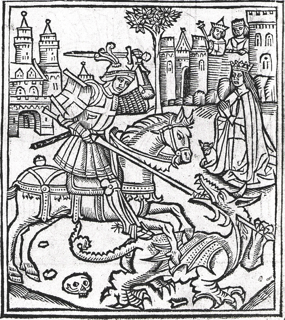 Woodcut of St George Slaying the Dragon from Life of Saint George, 1515, by Alexander Barclay (1476-1552)