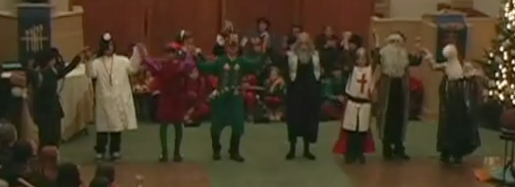 Good King Wenceslas, his court, and his subjects have gathered to celebrate the Feast of Stephen, despite the depredations of a marauding dragon in the neighborhood. (Both choirs process into the King’s Court singing Personent Hodie.) The King’s subjects sing some songs for the King to provide entertainment before dinner. After the boar’s head is presented (an elaborate processional featuring The Boar’s Head Carol, naturally) the lords and ladies sing for the king during his dinner.