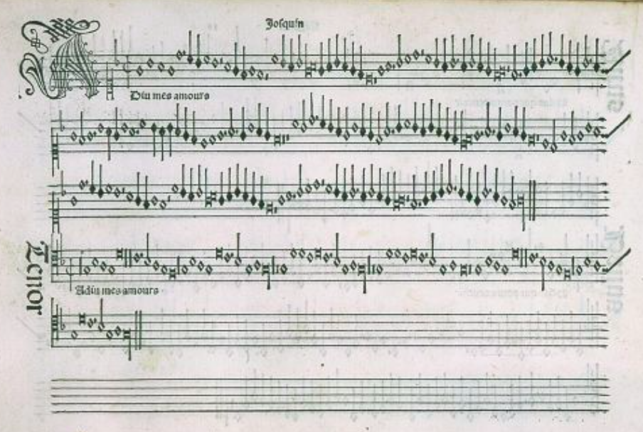 Adieu mes amours (Josquin) from Harmonice Musices Odhecaton, Petrucci, 1501, Venice (click to enlarge)