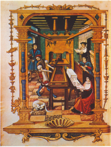 French print shop c. 1530 ~ miniature from “Chant Royal du drapier” MS fr. 1537, Bibliothèque Nationale, Paris. (click to enlarge)