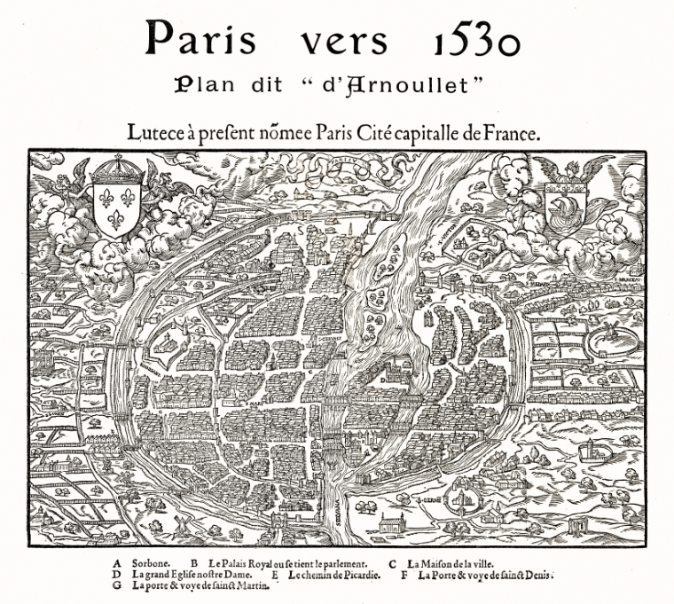 Paris circa 1530, during the reign of King Frances I of France. Originally created by Balthazar Arnoullet in 1550 and reproduced by A. Taride in 1908.