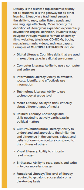 One of the most glaring omissions is in a sidebar to “Successful Student Characteristics”, “Multiple Literacies”: a list of 10 literacies the Strategic Framework claims are the district’s “top academic priorities for all students”. Music Literacy – which is one of the four declared goals of Music Makes Us – is not included in the list that includes: