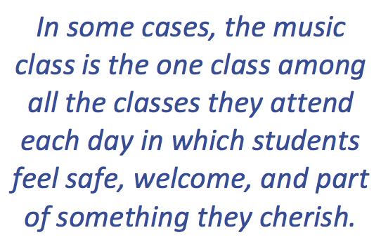 Added to this situation is the fact that (in most public schools at least) music classes are not required, but are electives chosen by those who participate – in most cases for emotional reasons. The music class becomes a kind of refuge for these students. In some cases, it is the one class among all the classes they attend each day in which students feel safe, welcome, and part of something they cherish.