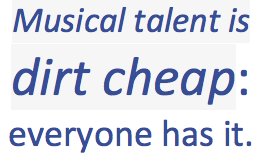 I was fortunate to realize early in my teaching career the tremendous benefits that a solid music education can have for all children. Musical talent is dirt cheap – virtually everyone has it to some degree. Most adults I have met can carry a tune, at least a little. Yes, the depth and intensity of musical aptitude varies between individuals, but what ultimately makes the most difference in one’s musical abilities are training and effort.