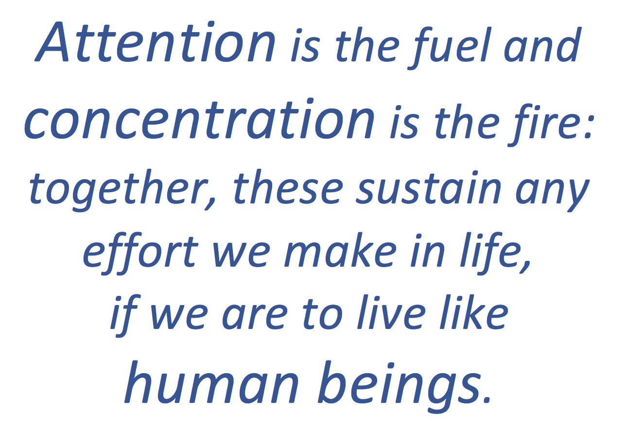 The force of attention is the fuel and concentration is the fire: together, these sustain any effort we make in life, if we are to live like human beings. Without attention, our efforts are empty, mechanical, “half-hearted”. But with an active, engaged attention, anything we do is enlivened by this deeper participation in experience. When we live this way, when we are engaged with this Wholehearted Attention, we experience our connection with all living things, with the universe.