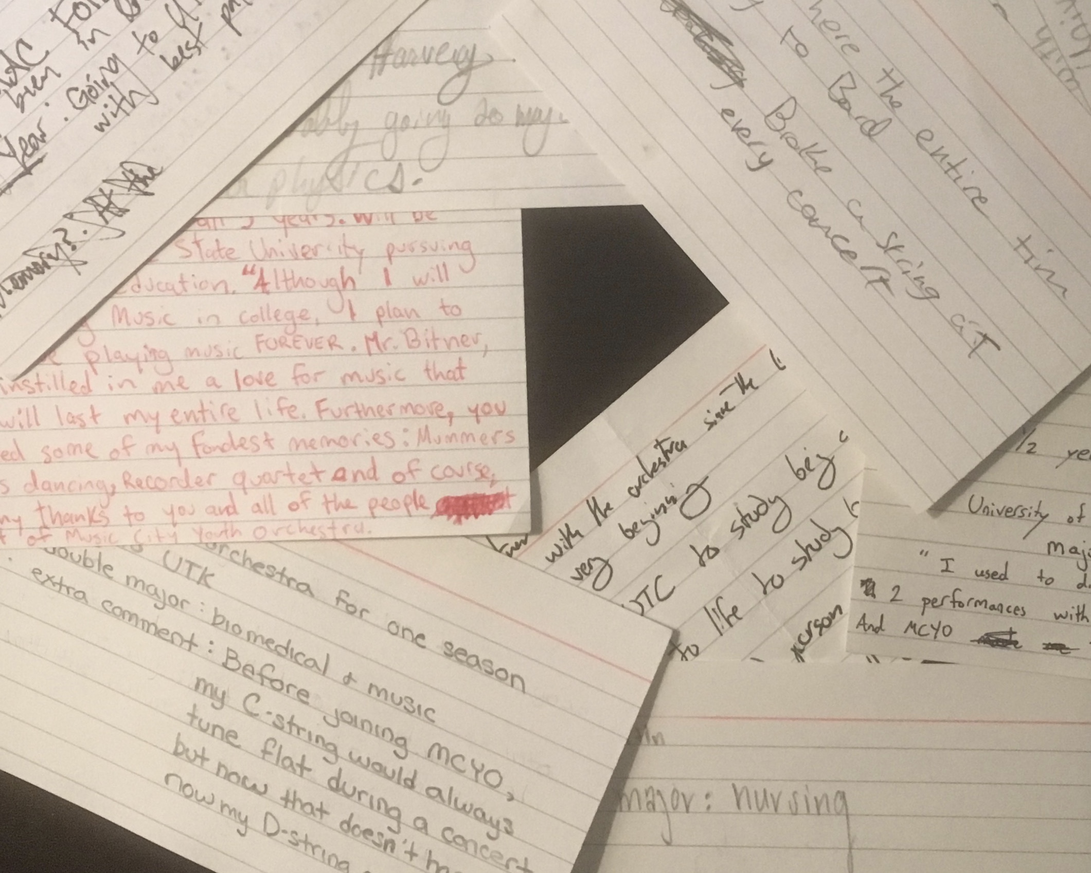 A day or two before the performance I gave a stack of index cards to the concertmaster, choirs student president, or other student leader, whose responsibility it was that year to distribute The Cards to each graduating senior and collect them back again once they had been written.