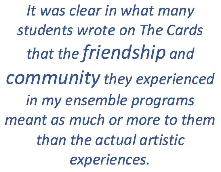 The Cards was always an emotional part of the Spring Concert, and usually there were tears involved for some on stage and in the audience. While some students wrote perfunctory Cards that only addressed the first three bullets I listed above, many expressed gratitude, or described a funny or touching memory of something that had happened in choir or orchestra that revealed how much the experience had meant to them. It was clear in what many students wrote on The Cards that the friendship and community they experienced in my ensemble programs meant as much or more to them than the actual artistic experiences.