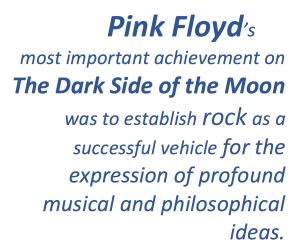 “The big move forward on Dark Side of the Moon,” said David Gilmour, Pink Floyd’s guitarist, “was Roger’s ‘coming of age’ lyrically, and having the ideas and the intelligence to take a subject and examine it in all its parts, in all those different songs.” Often the lyrics serve to focus the listener’s attention to what is being expressed by the music, instead of the other way around. (Think about it.)