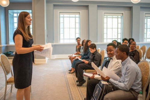 Accelerando Manager Kimberly McLemore welcomes students and parents, August 2, 2018 ~ photo by Sally Bebawy