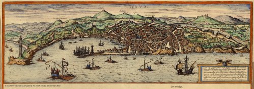 Genoa in the sixteenth century ~ engraving from Civitates Orbis Terrarum, Braun & Hogenberg, Cologne, 1572. Note the lighthouse, some form of which has stood on the Capo di Faro since the twelfth century.