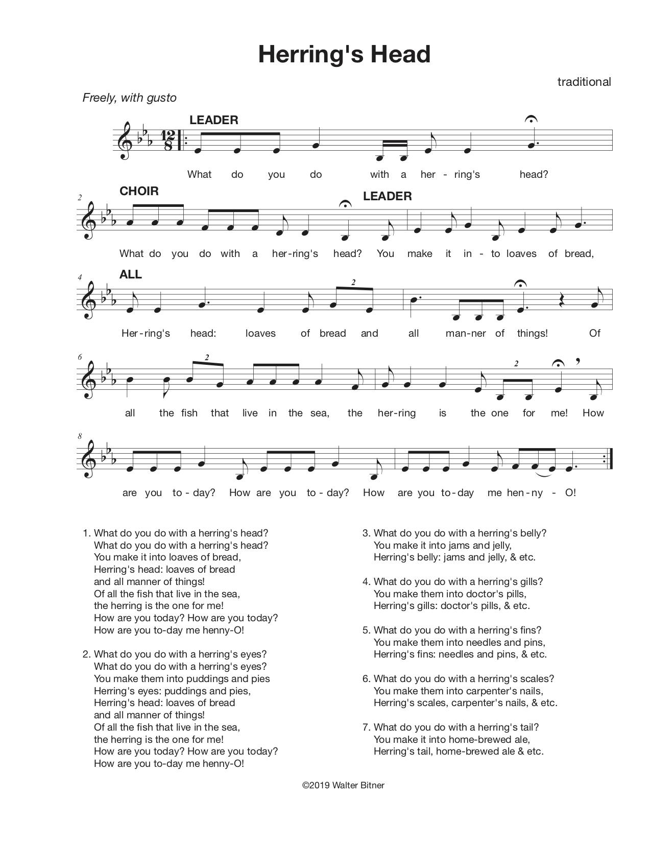 The leader’s initial call outlines the tonic major triad: What do you do with a herring’s head?, the choir responds back with the same question outlining the descending dominant seventh chord, and we’re off. With each successive verse a new measure is added (inserted after measure four of verse one) – that’s what makes this a “cumulative” song.