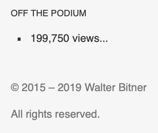 Readership is up. This is at least partially due to a marketing strategy I implemented from January – September, systematically promoting two or three articles each week via my FaceBook Page in rotation. It worked! and readership was directly impacted. Off The Podium had more than 47,000 views and more than 31,000 visitors in 2019, more than in any previous year. Alas! I discontinued this marketing strategy in October, when other duties demanded my attention.