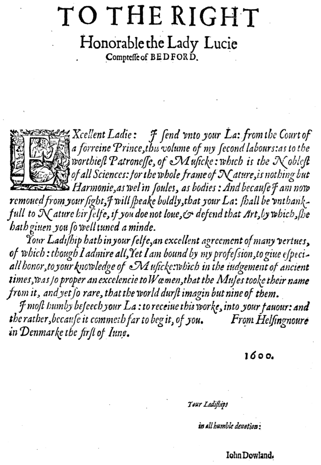 EXcellent Ladie: I send vnto your La(dyship): from the Court of a forreine Prince, this uolume of my second labours: as to the worthiest Patronesse, of Musicke: which is the Noblest of all Sciences: for the whole frame of Nature, is nothing but Harmonie, as well in soules, as bodies: And because I am now remoued from your sight, I will speake body, that your La(dyship): shall be vnthankfull to Nature hir selfe, if you doe not loue, & defend that Art, by which, she hath giuen you so well tuned a minde.