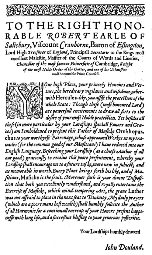 Your high Place, your princely Honours and Vertues, the hereditary vigilance and wisedome, wherwith Hercules-like, you assist the protection of the whole State: Though these (most honored Lord) are powerfull enticements to draw all sorts to the desire of your most Noble protection. Yet besides all these (in more particular by your Lordships speciall Fauours and Graces) am I emboldened to present this Father of Musicke Ornithoparchus to your worthyest Patronage, whose approvued Works in my trauailes (for the common good of our Musitians) I haue reduced into our English Language. Beseeching your Lordship (as a chief Author of all our good) graciously to receiue this poore presentment, whereby your Lordship shall encourage me to a future taske, more new in subiect, and as memorable in worth. Euery Plant brings forth his like, and of Musitians, Musicke is the fruit. Moreover such is your diuine Disposition that both you excellently understand, and royally entertaine the Exercise of Musicke, which mind-tempering Art, the graue Luther was not affraid to place in the next seat to Divinity. My daily prayers (which are a poore mans best wealth) shall humbly sollicite the Author of all Harmonie for a continuall encrease of your Honors present happinesse with long life, and a successiue blessing to your generous posteritie.