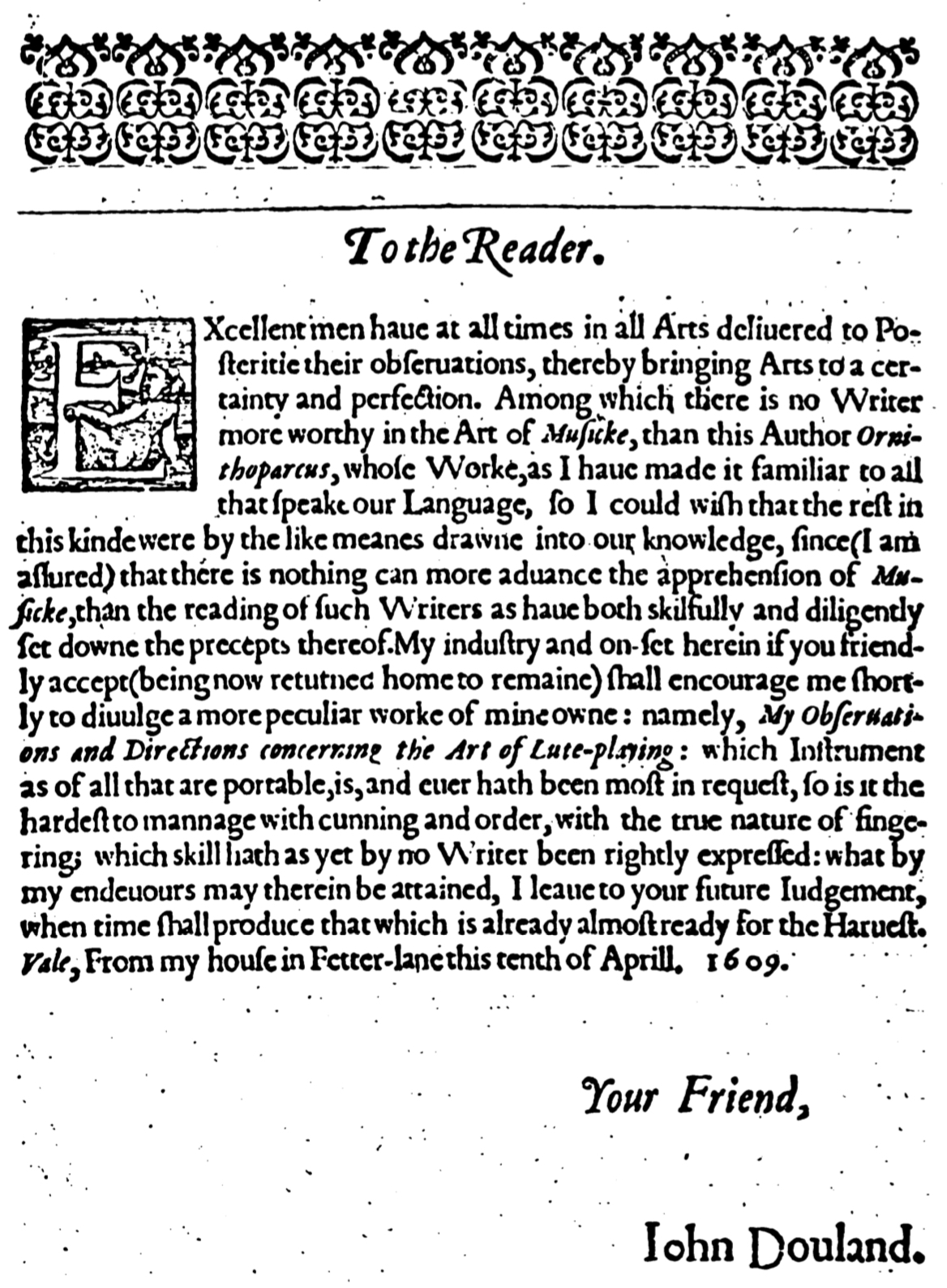 EXcellent men haue at all times in all Arts deliuered to Posteritie their observations, thereby bringing Arts to a certainty and perfection. Among which there is no Writer more worthy in the Art of Musicke, than this Author Ornithoparcus, whose Worke, as I haue made it familiar to all that speak our Language, so I could wish that the rest in this kinde were by the like meanes drawne into our knowledge, since (I am assured) that there is nothing can more advance the apprehension of Musicke, than the reading of such Writers as haue both skilfully and diligently set downe the precepts thereof. My industry and on-set herein if you friendly accept (being now returned home to remaine) shall encourage me shortly to diuulge a more peculiar worke of mine owne: namely, My Observations and Directions concerning the Art of Lute-playing: which Instrument as of all that are portable, is, and euer hath been most in request, so is it the hardest to mannage with cunning and order, with the true nature of fingering: which skill hath as yet no Writer been rightly expressed: what by my endeuours may therein be attained, I leaue to your future Iudgement, when time shall produce that which is already almost ready for the Haruest. Vale, From my house in Fetter-lane this tenth of Aprill. 1609.
