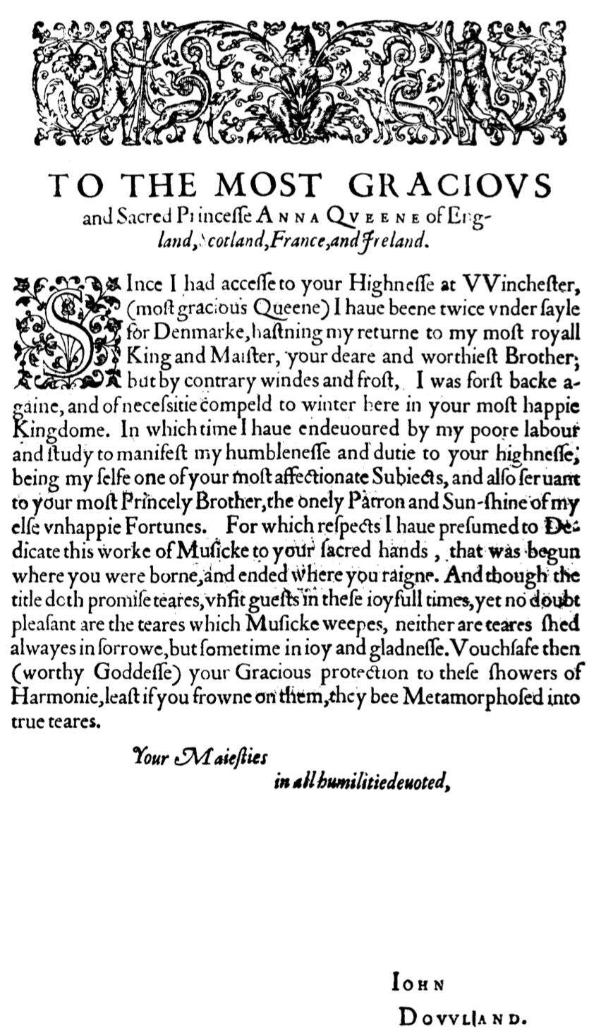 SInce I had to accesse to your Highness at VVinchester, (most gracious Queene) I haue beene twice vnder sayle for Denmarke, hastning my returne to my most royall King and Maister, your deare and worthiest Brother; but by contrary winds and frost, I was forst backe againe, and of necessitie compeld to winter here in your most happie Kingdome. In which time I haue endeuoured by my poore labour and study to manifest my humblenesse and dutie to your highnesse, being my selfe one of your most affectionate Subjects, and also seruant to your most Princely Brother, the onely Patron and Sun-shine of my else vnhappie Fortunes. For which respects I haue presumed to Dedicate this worke of Musicke to your sacred hands, that was begun where you were borne, and ended where you raigne. And though the title doth promise teares, vnfit guests in these ioyfull times, yet no doubt pleasant are the teares which Musicke weepes, neither are teares shed always in sorrowe, but sometime in ioy and gladnesse. Vouchsafe then (worthy Goddesse) your Gracious protection to these showers of Harmonie, least if you frowne on them, they bee Metamorphosed into true teares.